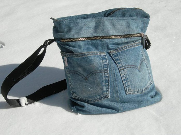 Min vän Tess hade en älskad märkesväska i jeanstyg, som började gå sönder efter lång och trogen tjänst. Jag gav mig på projektet att försöka kopiera den, och sprättade upp den gamla bit för bit för att kunna rita av. Det var mycket innerfickor, dragkedjor etc. att få på rätt plats,men det lyckades bra! Materialet är delvis hennes egna jeans, perfekt för en miljömedveten person som lever som hon lär. Som axelrem har väskan ett bilbälte från en Saab, ett av min mans många Tradera-köp till sin 90-tals Saab Cab, och den lilla "märkeslappen" Tess tog jag tillvara från en t-shirt jag hade!