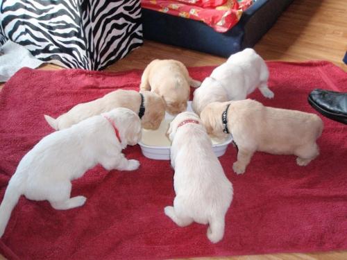 Nu är valparna 24 dagar, Dom kan:gå, äter välling, skäller, kissar i floder, ramlar ur sängen och ylar. Vilken utveckling.