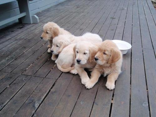 En beknat gjorde ett rejält "rasbyte" för några år sedan: från utpräglade arbetshundar (Siberian Husky) till en hund med lite annan karaktär. "Hur kom det sig?" undrade jag. Jo, på väg till det ställe där de skulle köpa sin nya Sibbe-valp stannade de till och fikade hos en Golden-uppfödare med leveransklara valpar... När man ser den här bilden förstår man hur det kom sig att de numera har en Golden-kille som lufsar runt där hemma... |