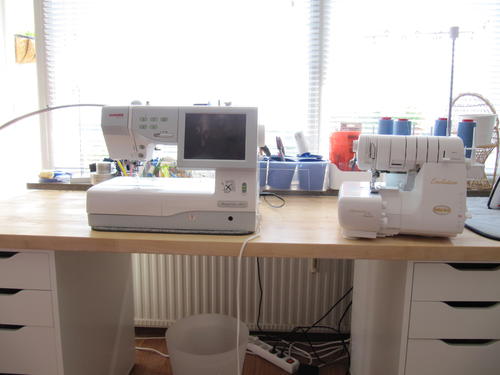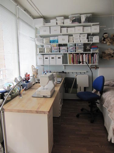 Del av ett större rum. Min man har gjort en förhöjning till skärmattan för att det ska vara bekvämt att använda den. Fick extra utrymme under pā köpet. Har gott om hurtsar för förvaring och en stor garderob där jag har mina tyger. Tillbringar mycket tid här