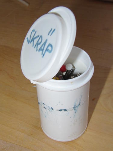 En pytteliten detalj i min syhörna, är min förvaring av trasiga nålar. En tom blodsockerstickburk, något man kan få av diabetiker.