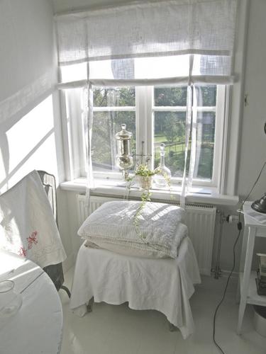 Min granne kom på en annorlunda lösning. Hennes badrumsfönster har viss insyn, men hon ville inte missta ljusinsläppet genom ex persienner, Så hon spände upp hennes mormors virkade duk inuti fönstret, dvs mellan glasen. Faktiskt planerarjag göra likadant, för det blev väldigt fint.:)
