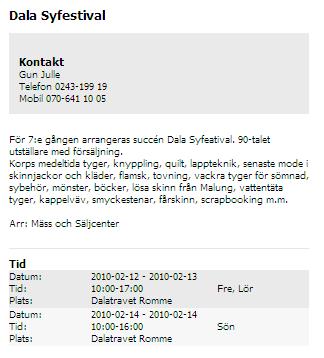 Hej. Synd att det inte syns på Sysidans Kalender. Har letat länge på nätet innan jag hittade Dala syfestival Borlänge .