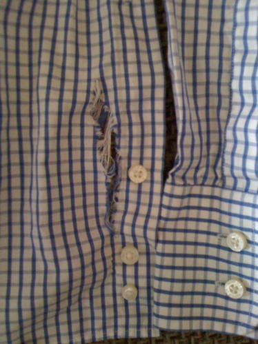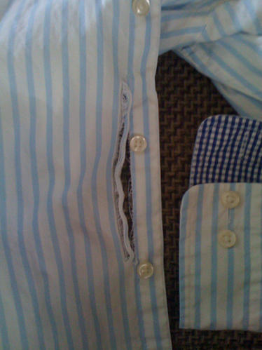 Kikade igen, det är ju precis vid knappkanten. Ja kanske uppenbar läge för lagningar, tyvärr. Lite svårt att korta in eftersom man har kragen man måste tänka på. Men nu blev man ju fundersam, hål på två olika skjortor! |
