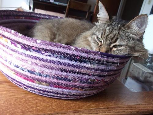 Jag har gjort några sådana korgar men se upp de är beroende framkallande. Har använt tågvirke sådan lina man förtöjer båtar med, har hittat dom på Ö o B. Skär med rullkniv eller klipper med sax, jag föredrar rullkniven för det går snabbast, skär de i 2 cm breda remsor och lindar de om tågvirket och sicksackar fast dem runt, runt tills man är nöjd med storlek och höjd. Filmen som man kunde titta på är bra, jag har tittat i en del böcker för att få inspiration. Du kan titta i mitt album där finns några korgar och en väska jag gjort i den tekniken. Malina:D |