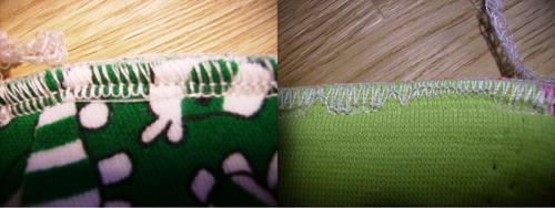 Jag har STORA problem med min overlock...när jag syr i 2 lager tyg är det inga problem alls och sömmen blir perfekt MEN när jag ska sy i tjockare lager (3 eller fler) så går det inte...sömmen binder inte ihop sig utan det bildas öglor på baksidan på mittentråden (4-trådig) och när det är ännu lite tjockare tyg så blir sömmen såhär:
