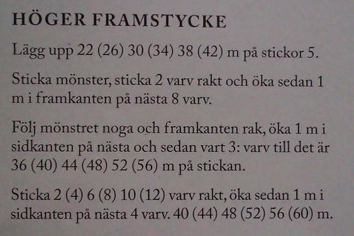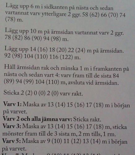 De första 8 ökningarna (öka inte innanför en maska! det blir mer som att lägga upp en ny maska varje varv) bildar den rundade framkanten. Nästa omgång ökningar sker i sidan. Därefter ökas det strax under ärmen (syns tydligt på bilden hur det bör bli). Sedan lägger man upp ärmens maskor, några i taget så att den blir vidast längst upp - när man stickar ärmen för sig och nerifrån och upp, så ökar man ju i båda sidor så den blir vidare och vidare, men när man stickar ärmen "från sida till sida" blir det till att lägga upp allteftersom. När du har ökat så att ärmen har sin rätta längd (92 m i minsta strl) börjar man minska för halsringningen - medan andra änden (som ju är längst ner på ärmen) stickas rakt. När så uppräkningen av varv helt plötsligt börjar så beskriver det att avmakningen av det högra framstycket börjar längst ner på ärmen, de sista avmaskningarna är uppe på axeln. Ja, det här var den bästa förklaring jag kunde komma på - mycket lättare att visa, men jag är kass på att rita-och-berätta |