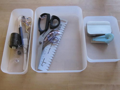Jag har en riktig snik-variant men i princip samma lösning. Jag tar (de svarta) plasttrågen som jag får när jag köper kött och lägger prylarna i dem. De går dessutom att stapla i varandra när de inte behövs och kommer i några olika storlekar.
