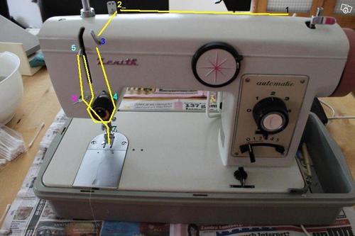 vid 2 ska du runda llla knappen på baksida, upp genom nåt ev de små skårorna i bleckets topp, 3 ser rätt ut, 4_5_6 är den knöliga delen , runt knappen ( iskåran) dra med den där spretiga metalltråden så stt din trådhäktar fast mot den fasta metall flärpen, ( då fjädrar spretmetalltråden tillbaka) sen upp som du gjort, på nervägen styr in tråd i den där kraftiga öglan, längst nere vid nålen dra bara tråden bakom metalltrådsknorren från vänster till höger så hamnar den inne i den öglan, .