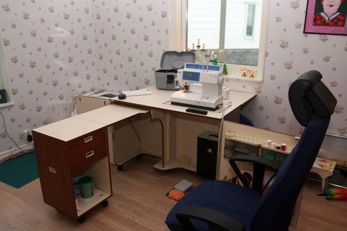 Här har jag 5 stycken av mina 7 maskiner, det är inte bara broderi jag pysslar med här. Rubyn får inte plats här så hon "bor i hallen" Mina brodertrådar förvarar jag i en hurts som står i sovrummet. |