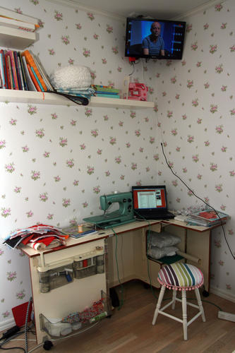 Så här ser det ut i min sy- och stickhörna. Det är ena halvan av ett stort arbetsrum som sambon och jag delar. Andra halvan är datorer, synt och garderob för tyger och garner. Det är inte städat! Under gröna skynket döljer sig en av mina sex stickmaskiner. En till syns vid fönstret. En antik sockstickningsmaskin. Min Hq quiltdesigner II döljer overlocken. Bordet räcker inte riktigt till för två maskiner framme. Speciellt inte som jag använder delar av det till sockstickningstillbehör. Garnet på golvet kommer från en sänglåda i ett rum som just nu är uthyrt till en student. Förhoppningsvis får det komma tillbaka med tiden. Jag har lite planer på att lägga beslag på det rummet när studenten flyttar. |