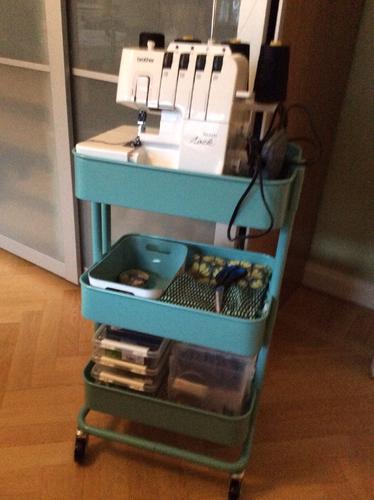 Nej jag syr inte på den men använder vagnen för att flytta den & allt annat material jag behöver. Den är helt suverän! Som komplement har jag stabelbara plastlådor till knappar, resår etc som jag förvarar i lådan längst ner. Sparar mkt spring på detta sätt! :-)