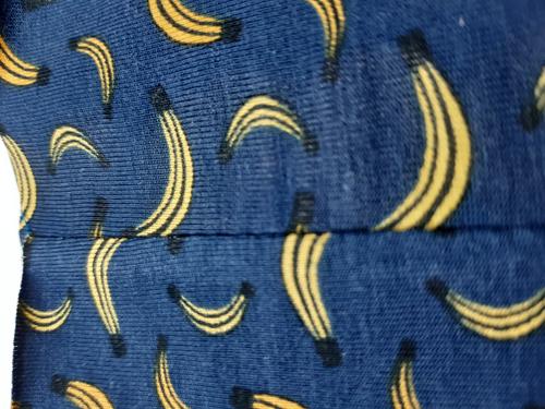 Man får prova sig fram, testade 10 sömmar och fann att "öppen overlock" på vanlig maskin och sytråd fungerar bäst mot tyget. Tillbaka till normal trådspänning och nål. Den går att sy i kant och kommer att fungera, sömmen som syr ihop blir lika fin som fabricerat. Notera att varianten den stängda overlocken med yttersöm trasslar. |