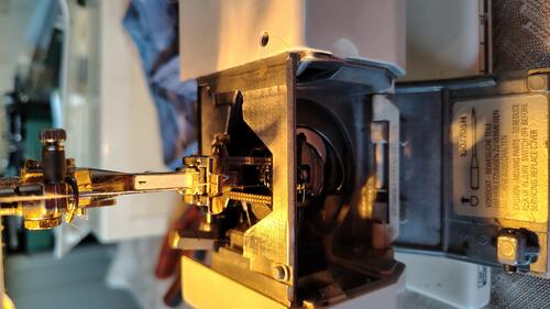 Sydde kapell med min Bernina 1001. Helt plötsligt så började nålen ta emot greppkorgen. Den är liksom otajmad med korgen. Någon som vet hur man justerar det? |