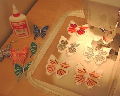 Här kommer min stygnsättning (i JEF) för att göra fjärilsbroscherna som finns på bilder i mitt album. Använd med fördel en melerad tråd i mitten av fjärilen. Sätt enbart ultrasolvy i ramen och låt den första sömmen sy fast en vlieselineförstärkt tygbit. Klipp bort allt tyg utanför konturerna och fortsätt broderiet. Riv sedan loss fjärilarna försiktigt. Gör 1 eller 6 st. Ha det gott! ![]() /Gunilla |