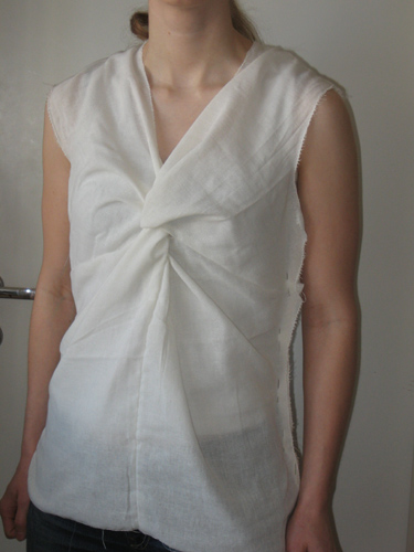 Jag hittade ett intressant mönster med draperingar, men när jag sydde upp ett test blev det inte alls bra. Sydde i ett glest linnetyg, eftersom jag trodde att det skulle passa bra med något som är lite stelt så att vecken skulle synas bra, men det ser bara skrynkligt ut.