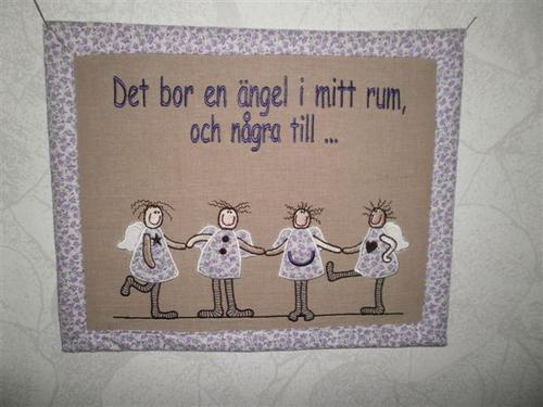 Jag har i dag för första gången sytt mönstret som är på änglakudden som var här på sidan för ett tag sedan. Men jag sydde fast kudden i kudden,hahhaha.sådär för så bide det ingen kudde, det blev en vägtavla som jag blev riktigt nöjd med , fast hörnen blev ju inte helt perfekta, men jag är nöjd ändå.