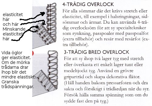 sy provlappar med lite olika inställningar då ser du hur det fungerar och vilken tråd som gör vad. Dessutom är det lite skillnad på 3 eller 4-trådig söm då den fyrtrådiga har en extra sömrad och ska ge en fastare söm. |